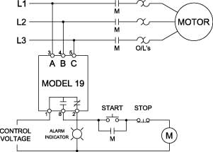 The Model 19 continuously monitors 3-phase power lines for abnormal conditions. When properly adjusted, the Model 19 monitor will detect phase loss on a loaded motor even when regenerated voltage is present.