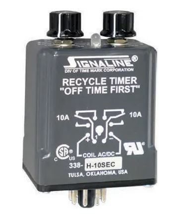 The Models 338 and 368 Recycle Timers are designed to cycle a load on and off, or to cycle between two loads. The ON and OFF cycles are independently adjustable on each model. The Model 338 is a DPDT potentiometer (knob-adjust). The Model 368 is a DPDT, high-accuracy digital input timer. Solid-state circuits in each model drive an internal electromechanical relay. Each model is functionally interchangeable. They are available in a wide variety of voltage and timing ranges, to cover the majority of application requirements. An SG version of this model is available using silver with gold flash contacts.