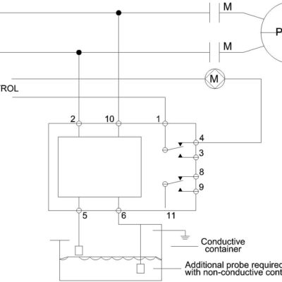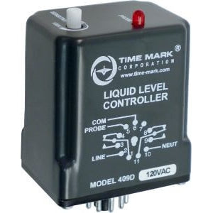 The Model 409D is a compact, socket-mount device for level control of conductive liquids. The internal relay is energized when operating power is applied. When the liquid level reaches the probe, the relay de-energizes. When the level drops below the probe, the relay will reset. A fixed, 300ms time delay prevents oscillation due to wave action. Probe cables may be shielded or unshielded. If the liquid container is made of a non-conductive material, a common electrode is required. Other features include an LED indicator to show the output relay status and an adjustable sensitivity setting. Requires a standard 11-pin octal socket (such as the Time Mark model 51X016).