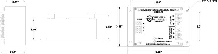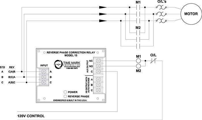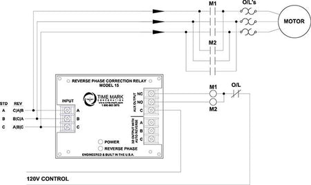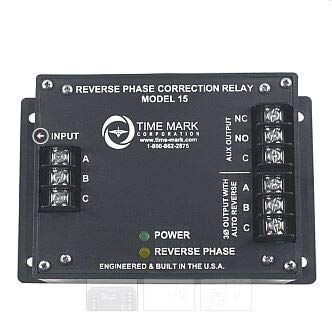 The Time Mark Model 15 was designed to protect your valuable equipment from the damaging effects of phase reversal by sensing and automatically correcting for phase reversal. Under normal power conditions, incoming A B C voltage is passed straight through the device to the A B C output terminals (4 amps @ 480 VAC resistive max). If the unit detects an incoming reverse phase condition (C B A), it will light the reverse phase LED and internally switch 2 of the phases and then pass the corrected phasing out to output terminals A B C. If your load is higher than 4 amps @ 480VAC resistive.