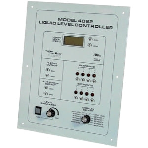 The Model 4082 Liquid Level Controller monitors, displays and controls water level up to 34.6 feet in a tank or reservoir. The Model 4082 operates from the 4-20mA input signal provided by either the Time Mark Model 450 or Model 456-15 Pressure Transducer. This 4-20mA signal represents the water level to be controlled, where 4mA equals zero feet, and the 20mA equals 34.6 feet. A liquid crystal display (LCD) is provided to show the water level during normal operations, and the set-point values during calibration. There are eight user-adjustable trip set-points. As the water level rises above each trip point setting, the front panel LED for that level illuminates, and the corresponding output relay energizes. Two 4-20mA outputs, which track the 4-20mA input, are also provided. These signal outputs can be rescaled to different ranges of level by the user. A test control, that simulates an input signal, is available on the front panel. The test control is useful for checking the trip set-points, and overall system operation.