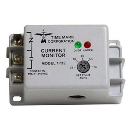 The Model 1732 generates its operating voltage from the monitored current line, so no external power supply is required. A current greater than 25 amps is needed to energize the internal relay. The maximum current set point is 150 amps. The Model 1732 is not frequency sensitive, and can be used on AC currents from 50 to 400Hz.