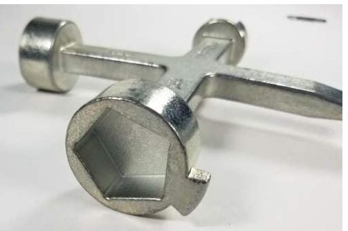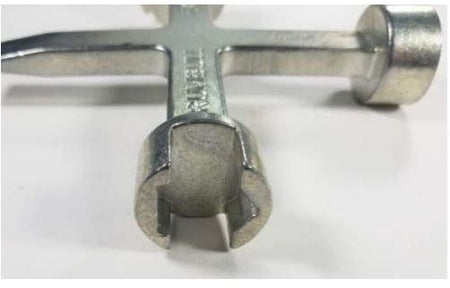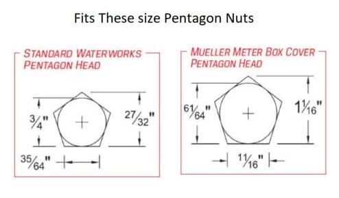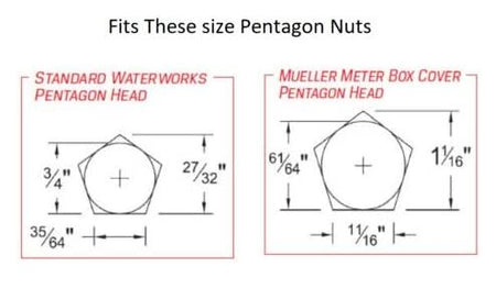 - 2 - Standard (small) meter box pentagon nut wrench - Has recesses in socket for lifting retaining the nut and lifting lids. Also slotted to work as meter shutoff valve wrench